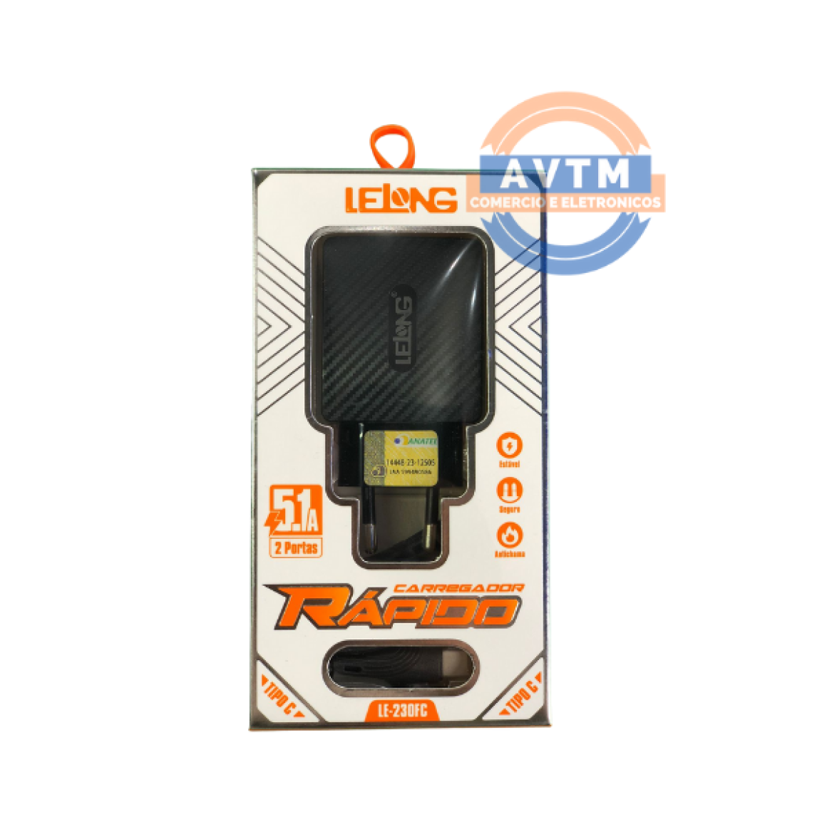 LE-230FC Carregador Rápido Lelong – 2 Portas + Cabo Tipo C